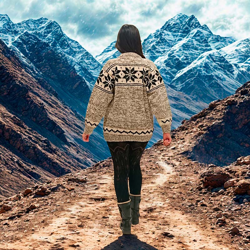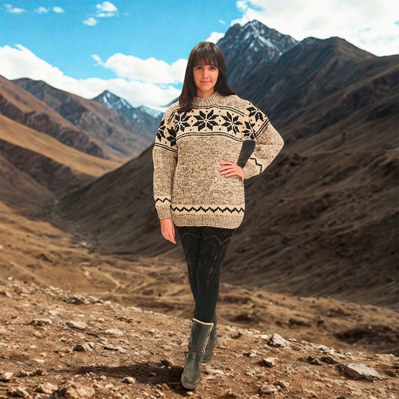 Este jersey artesanal de lana combina calidez, comodidad y un diseño clásico inspirado en los motivos nórdicos. Su tejido grueso y suave lo convierte en una prenda perfecta para el invierno, ideal para quienes buscan abrigo sin renunciar al estilo. El patrón geométrico en tonos negros aporta un toque tradicional y armónico, mientras que el color base beige moteado realza su aspecto acogedor y natural. Su corte recto, ligeramente holgado, permite libertad de movimiento y una caída favorecedora para diferentes tipos de cuerpo. Una prenda versátil, perfecta para el día a día : paseos, montañas, clima frío o simplemente para mantenerte cálida en casa. Cada Jersey viene elaborado con lana auténtica.